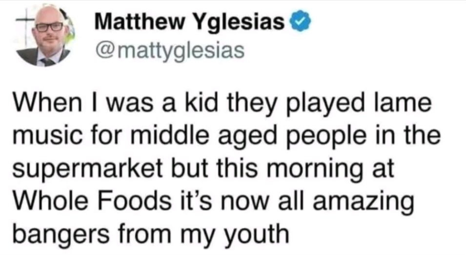 The other day he said something about how grocery stores always used to play boring old people music in his childhood, but now that heâs middle aged they all play cool songs from his youth. Like my understanding is this was said with full sincerity, and that it was cool that grocery stores played better music rather than grasping that they merely play music that middle aged people enjoy. I really believe itâs sincere too because if itâs not that would make it easily the funniest and most clever post that man has ever made, and I canât think of another instance of him being either funny or clever.