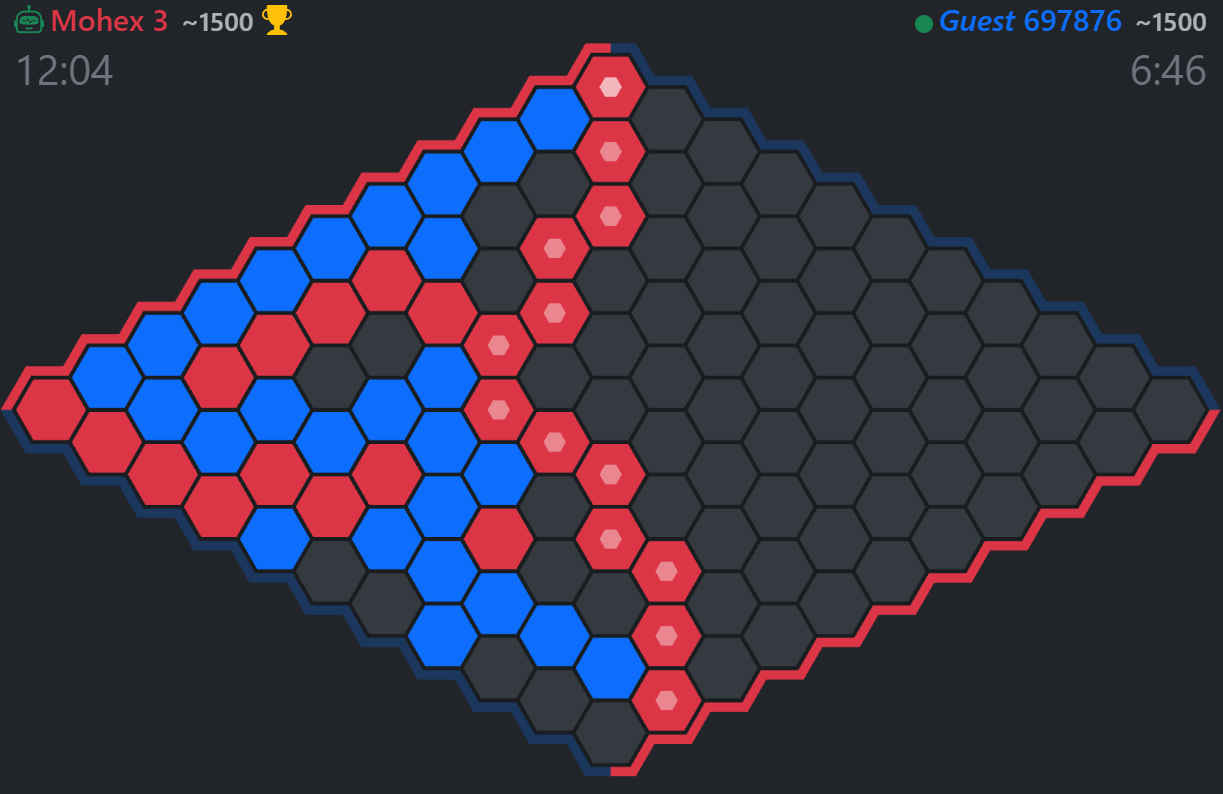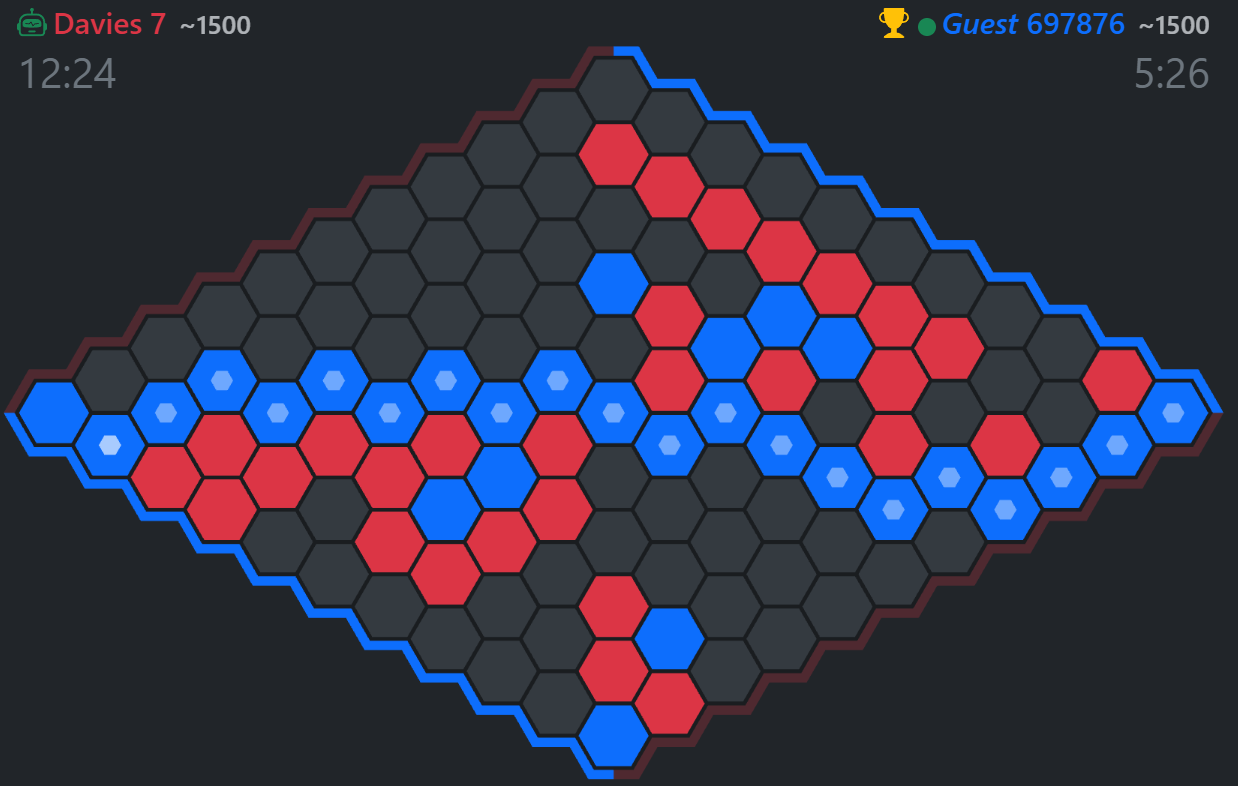 another blue game, just beat a slightly easier but still hard bot. there was an optimal move that it coulda done and won but didn’t,which is a bit michael mouse, but the game is effectively decided after so few moves that its the only way i can win since i suck at openers