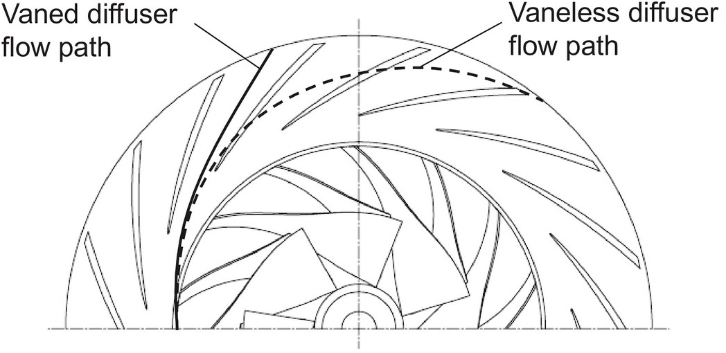 There does, of course, exist a spectrum of solidity for the designer between the fully vaned and fully vaneless diffuser, where the vanes can be made quite short. These low-solidity vaned diffusers (LSVDs) have wider operating ranges (as they act more like airfoils in cascade, rather than traditional channels) at the cost of lower pressure recovery. It is up to the designer to decide the tradeoff in operating range and efficiency, but they always be aware of the rich spectrum of solutions which have been created for this purpose. The designer who is excessively dogmatic in their use of either vaneless or wedge vane diffusers leaves efficiency on the table!