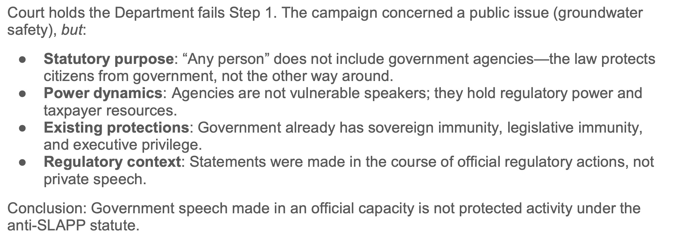 (It is slightly more complicated than this: the case in question - a fictional one - states that a governmental agency cannot make statements about specific companies because the agency possesses power over them, which is…the entire point of an agency being able to make statements? A company suing because the agency goes, “We have evidence to prove [company] has been the source of numerous outbreaks” should be dismissable under anti-SLAPP.)