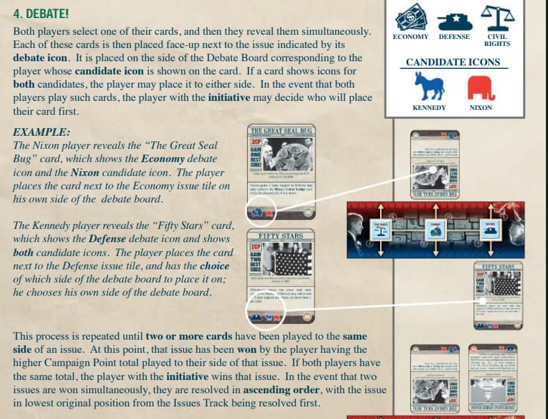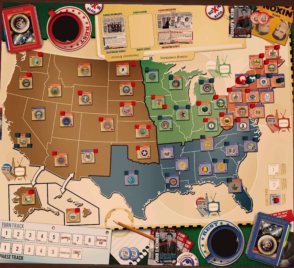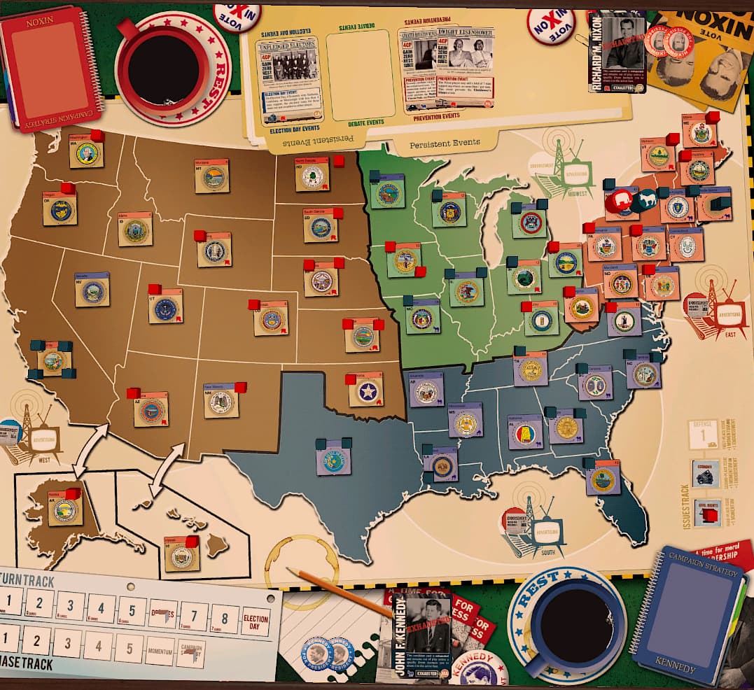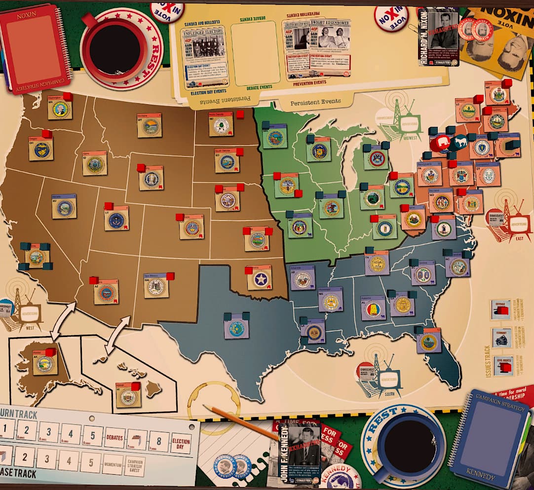 Kennedy wins the defense issue, and places three support cubes in New York and one in Pennsylvania