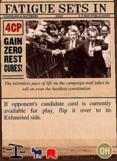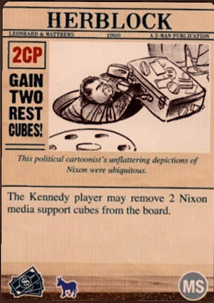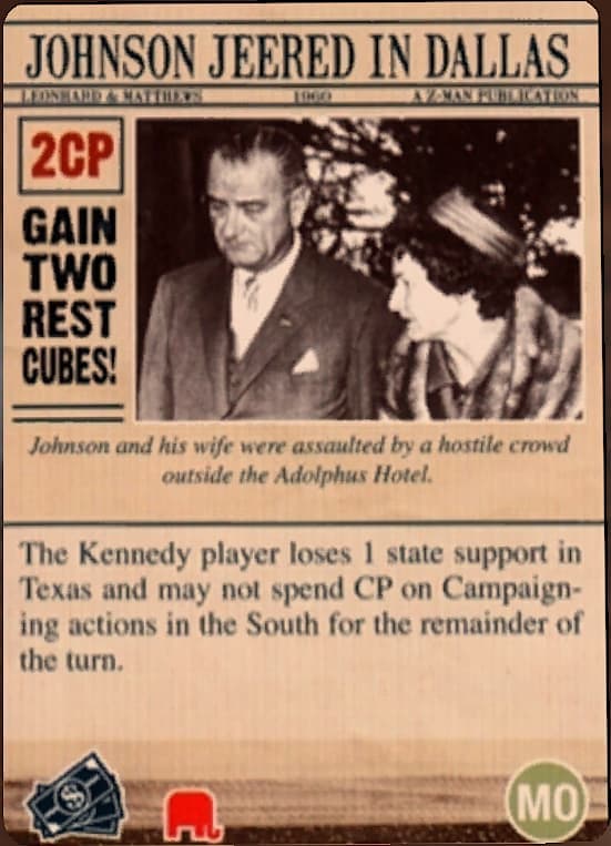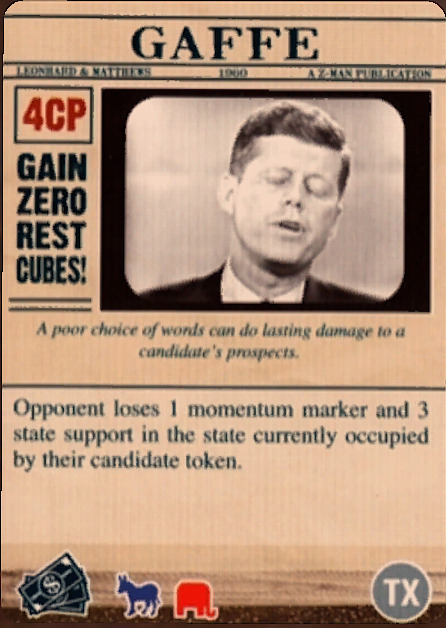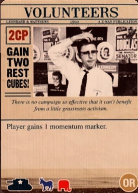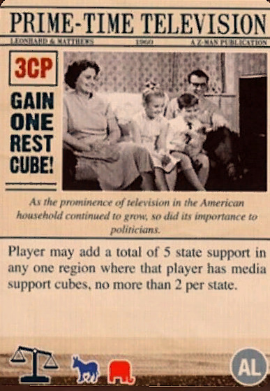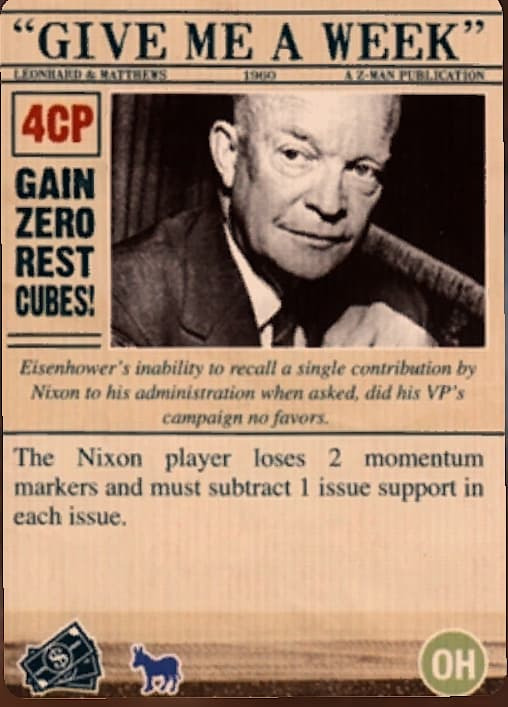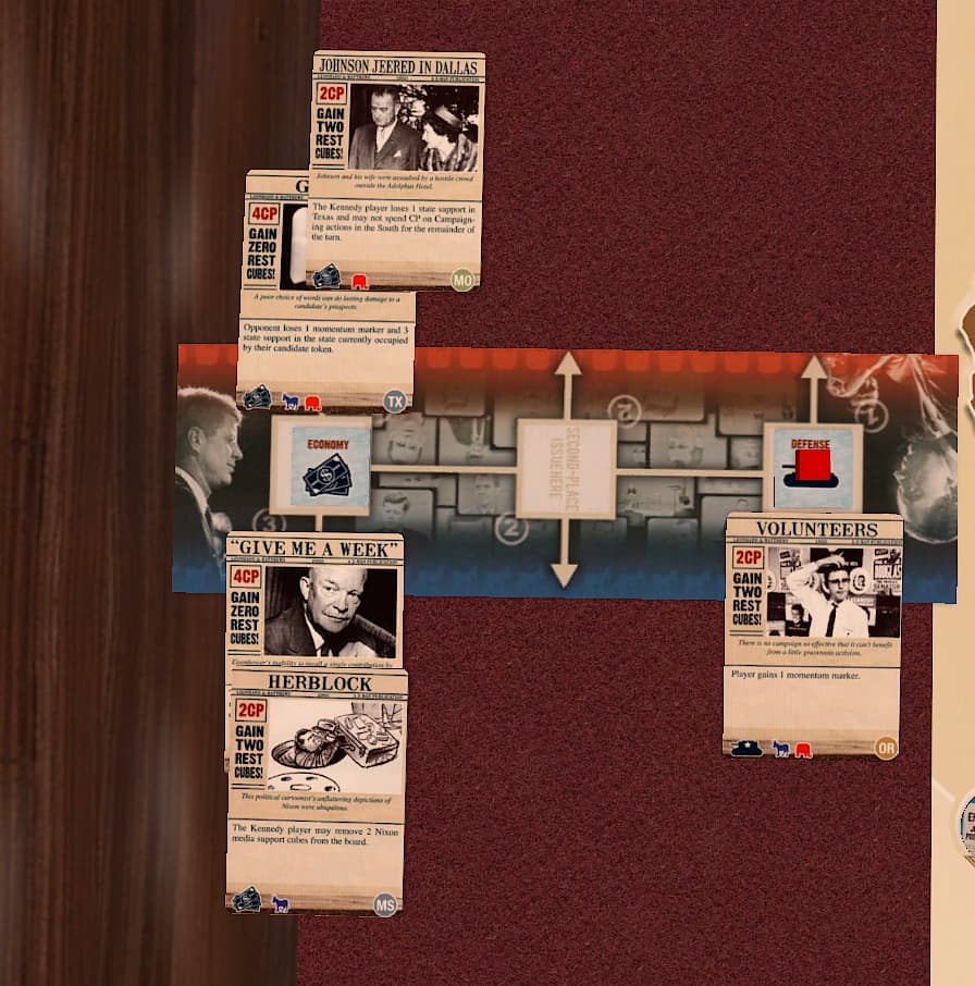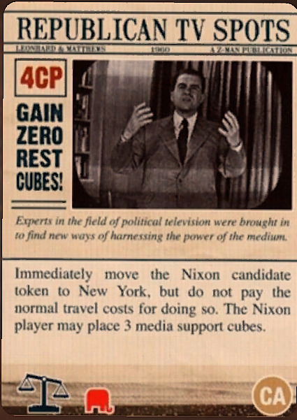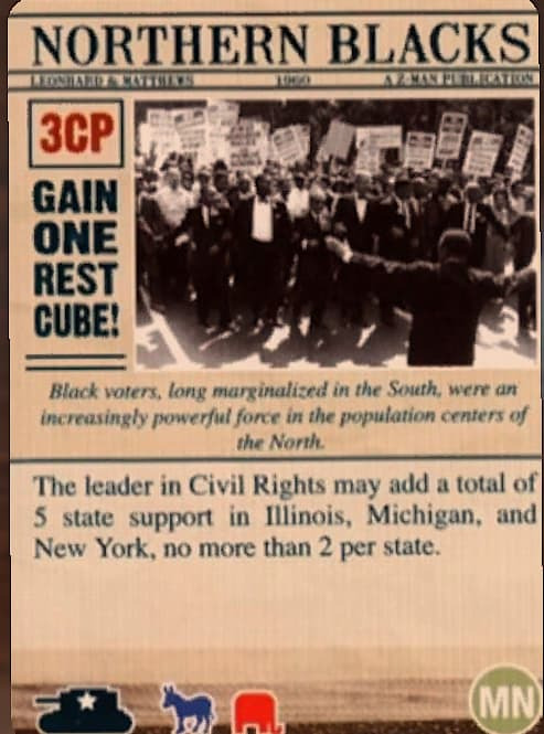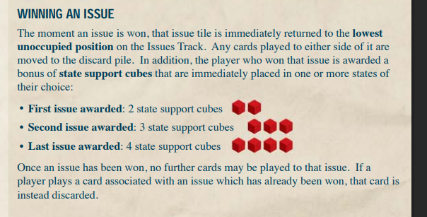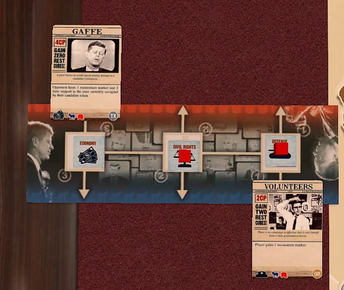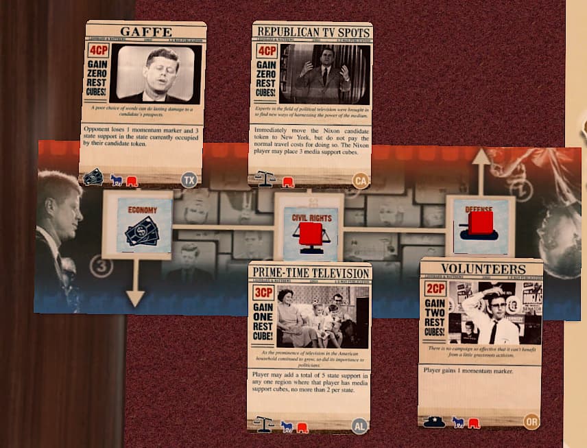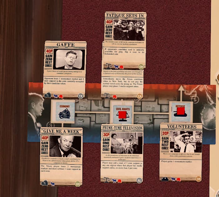 Nixon wins the Civil Rights issue! It is moved to the 3rd issue slot and Nixon chooses to place two support cubes on Ohio