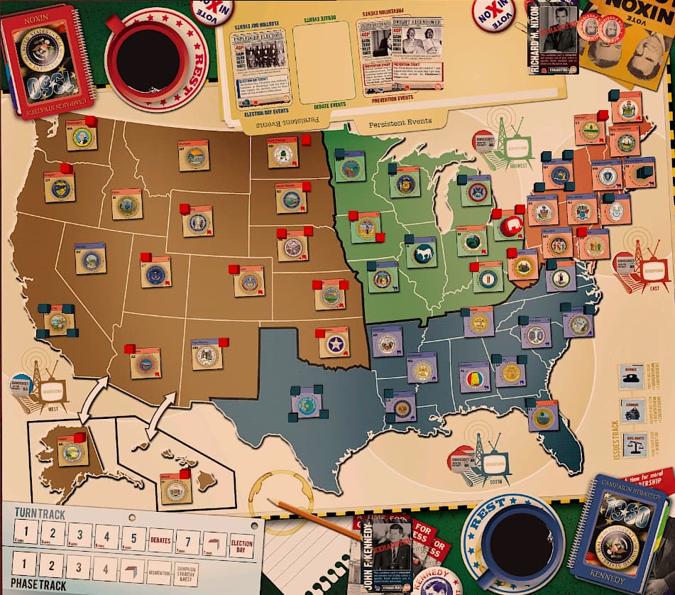 JFK activates their candidate card! Placing support cubes in Minnesota, Wisconsin, Michigan, Missouri, and Illinois!