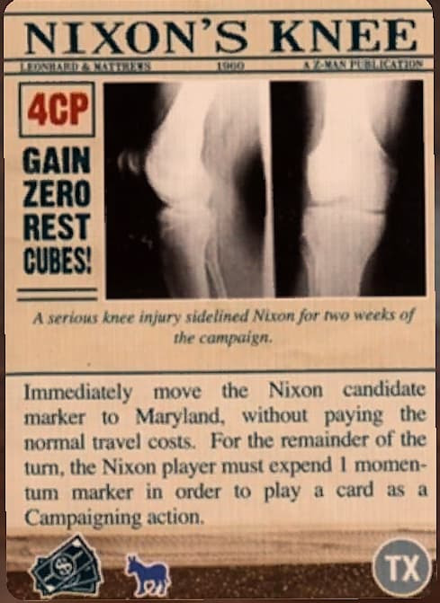 … for its event text! Nixon is moved to Maryland and must expend momentum in order to play a card as a campaigning actionf or the remainder of turn four!