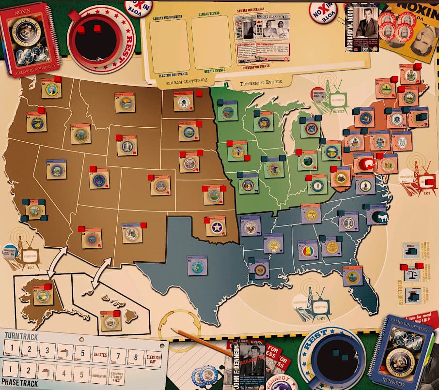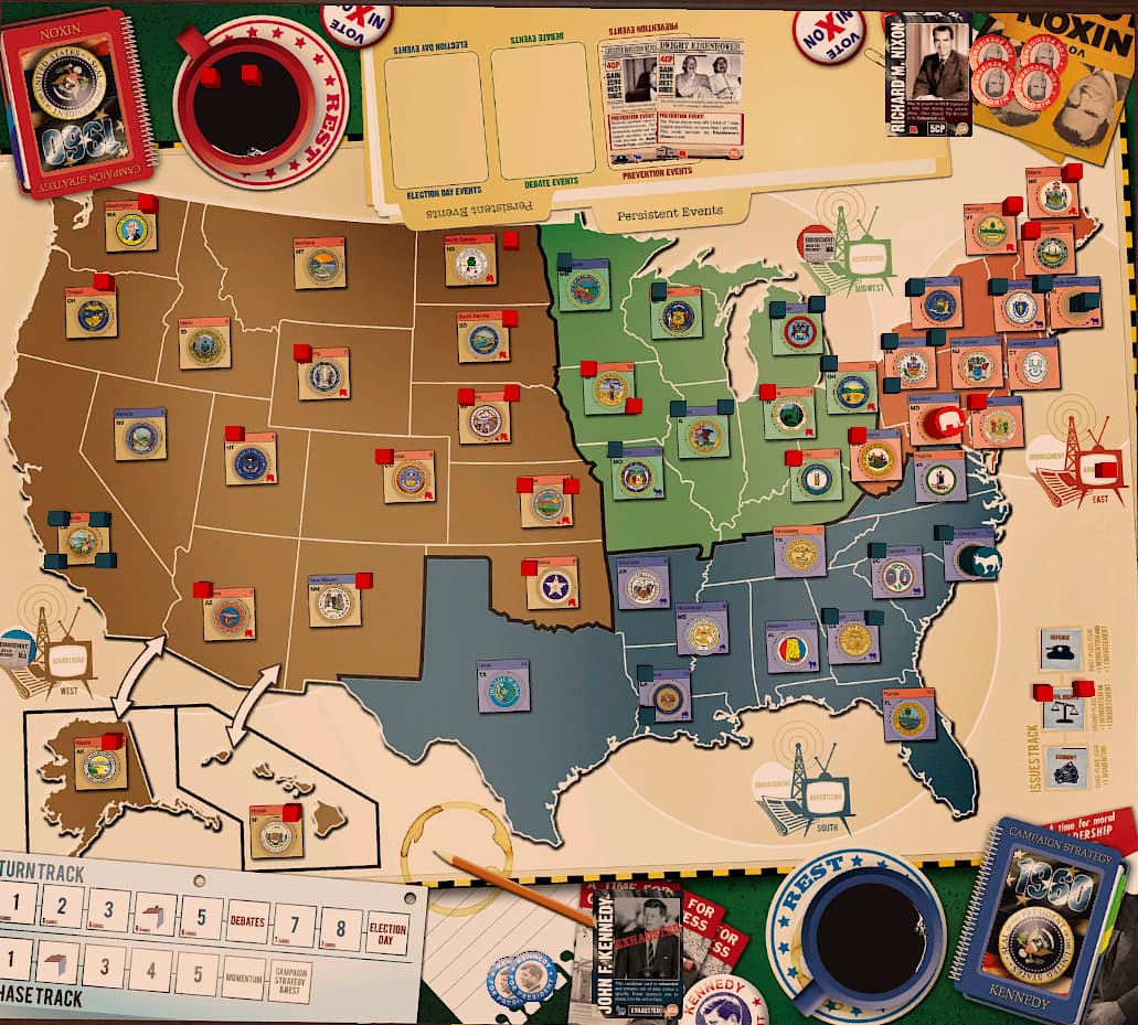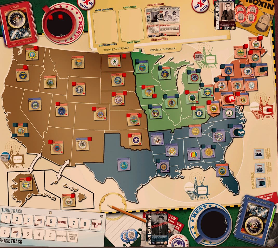 Nixon wins the 1st and 2nd Issues, opting for a momentum token for winning the second issue, and places an endorsement token in the midwest as a reward for winning the 1st Issue