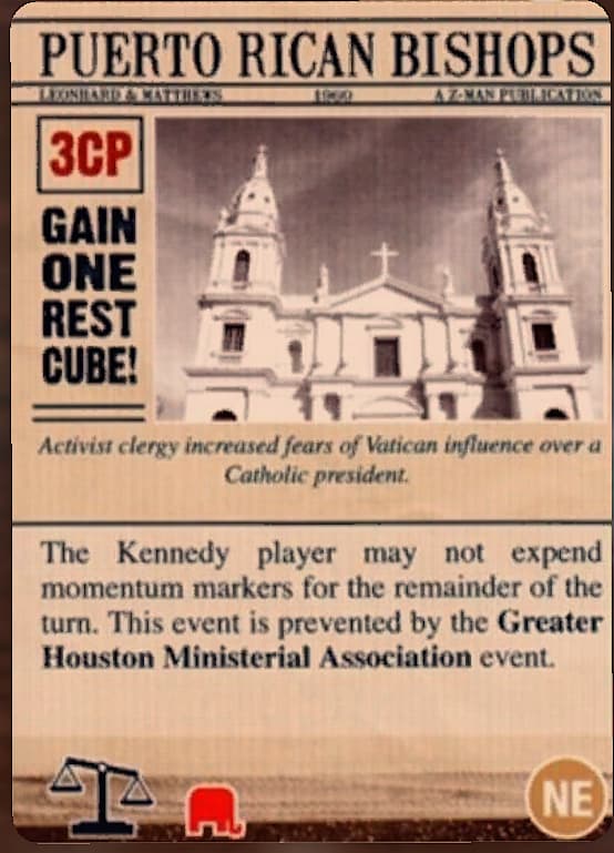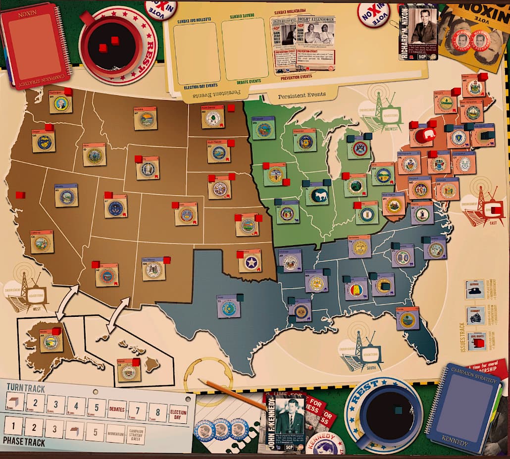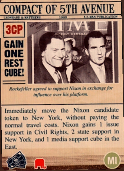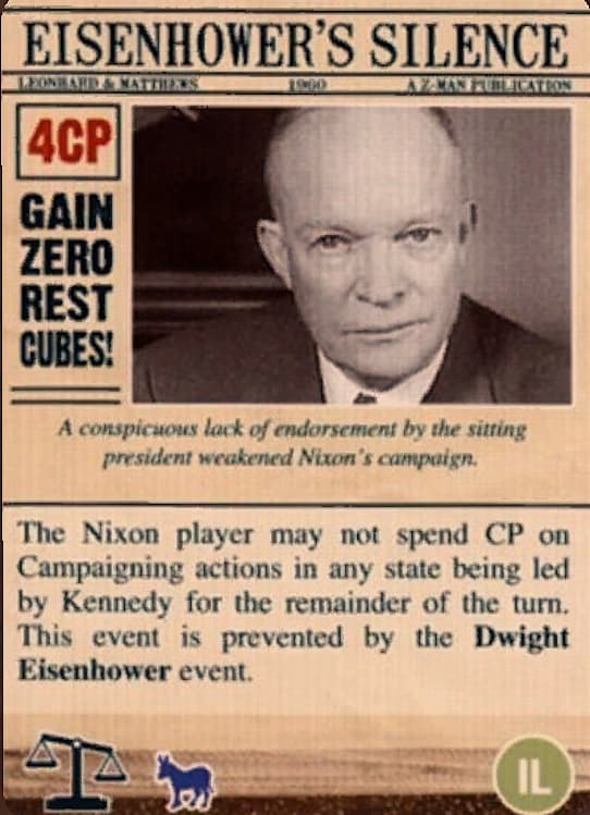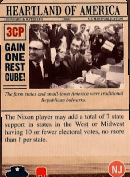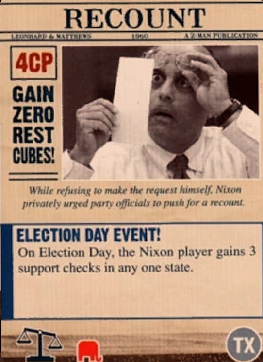 …for its campaign points value, moving to Pennsylvania and placing 3 support cubes in the aforementioned state. Due to JFK spending two momentum to preempt the Recount event the Nixon Campaign may not spend a momentum to activate it’s event text.