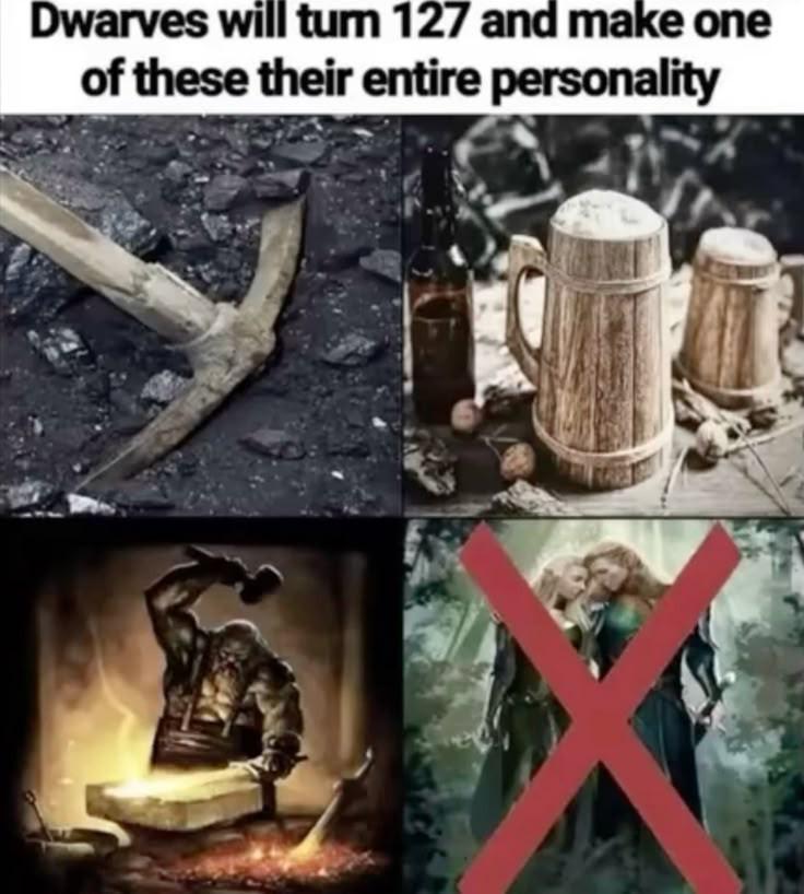 the drunkard blacksmtsh, who mines the ores for themselves, and hates the elves, can be a very common dwarf trope.