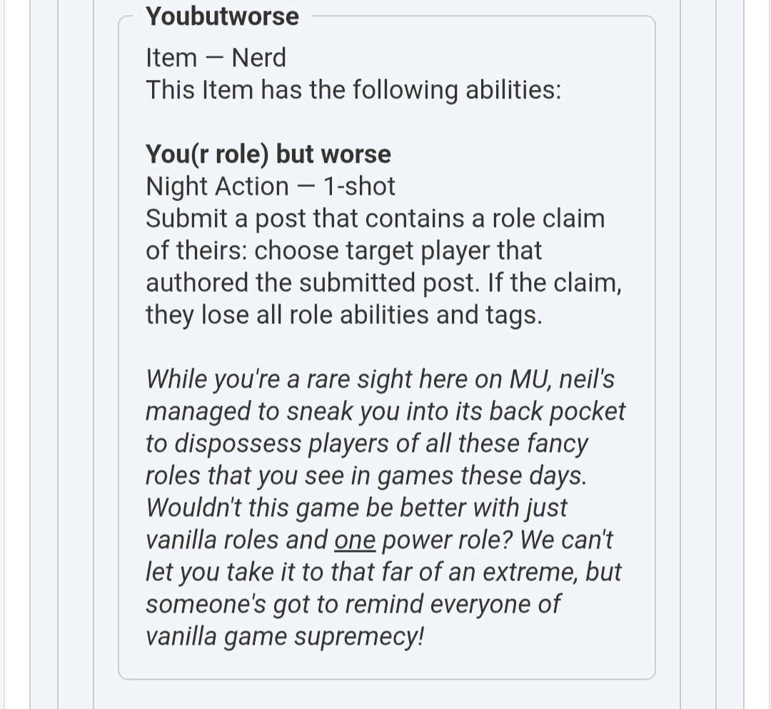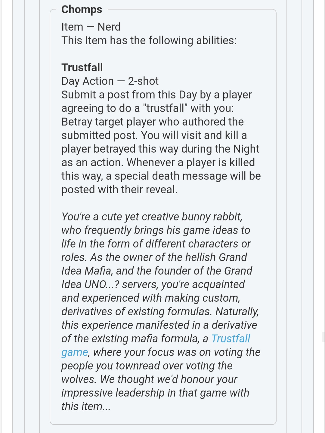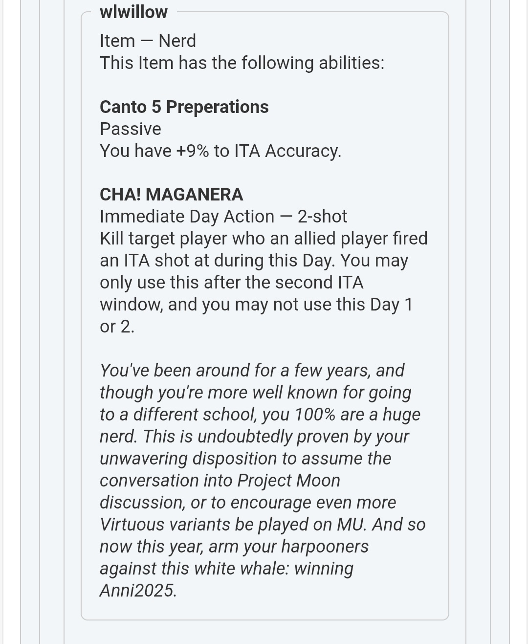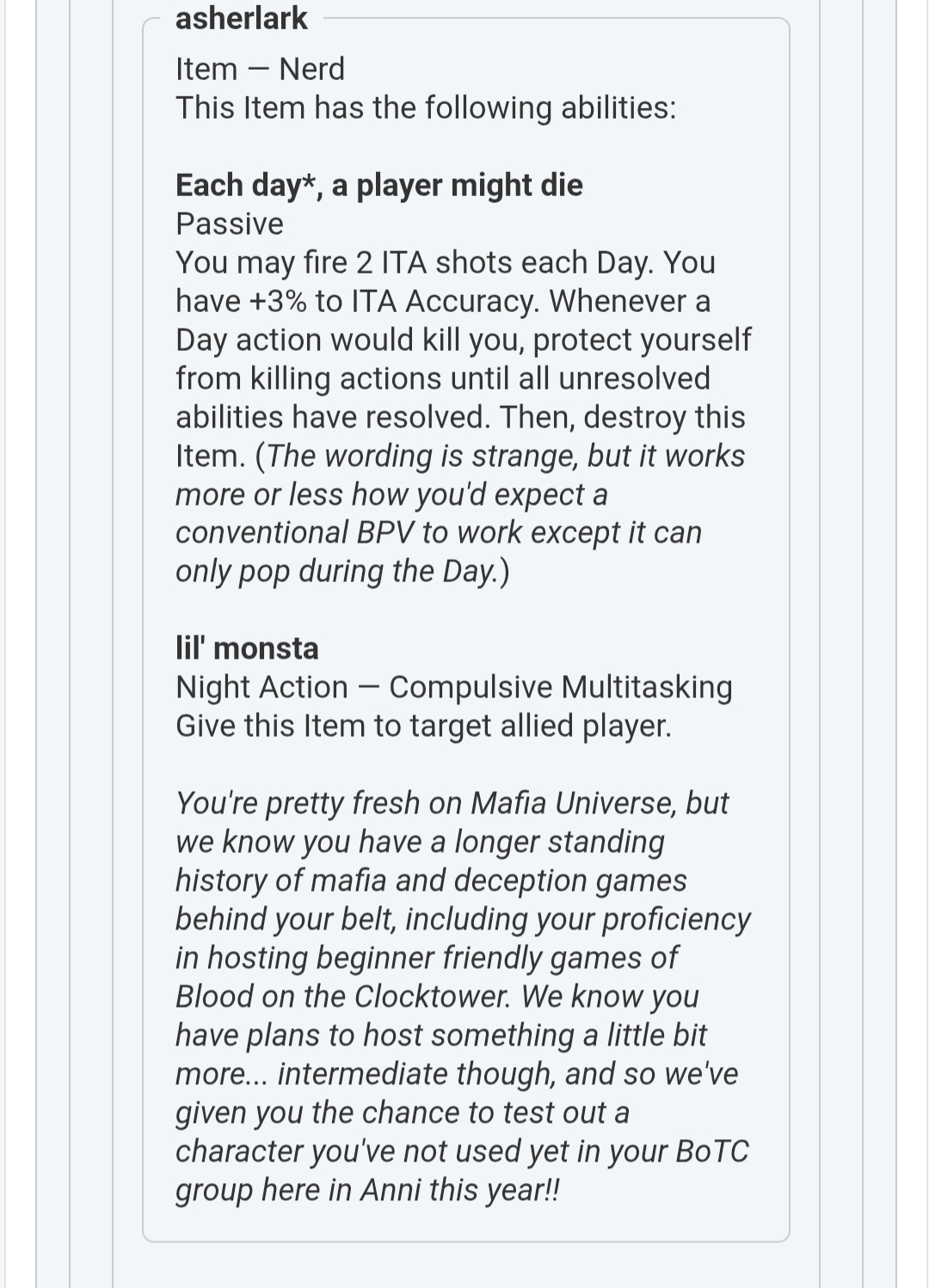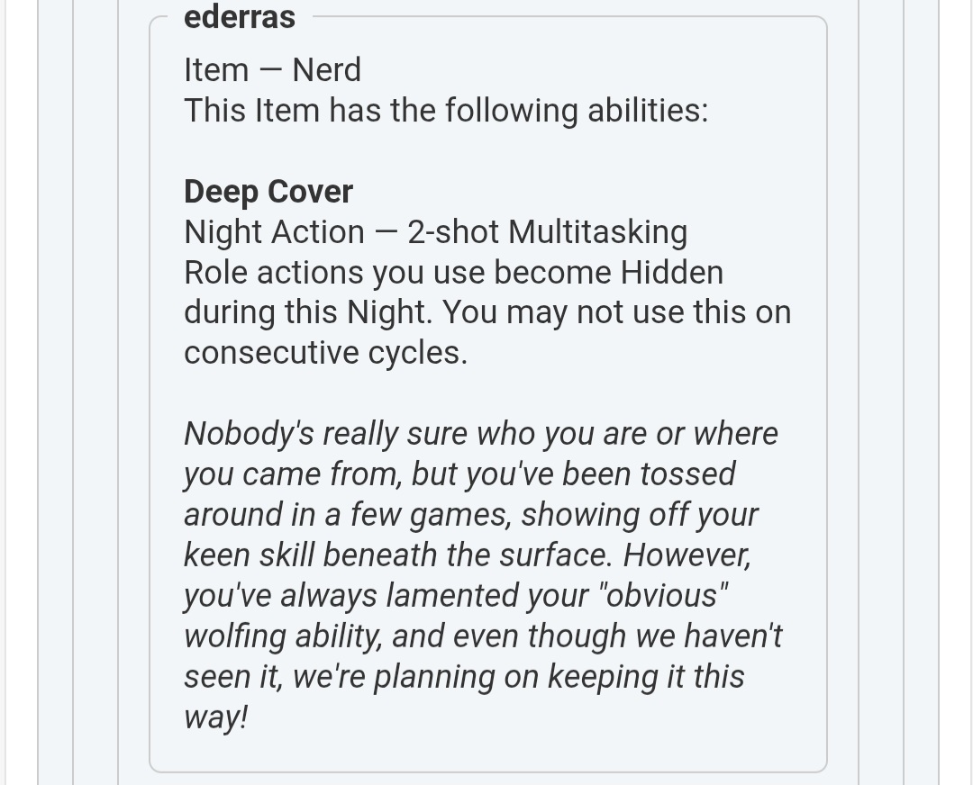 Back to tavern. Chat with Dane. Mr. Thorne drunk, showed intent to search guild building thoroughly. ((âŠunless Wolves can act drunk, this decreases the likeliness of him being one. However, if not Thorne, then who Wolf?))