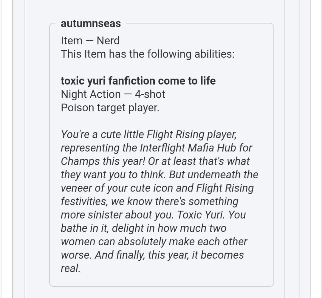 Challenged by Dahlia for RPS after she returned from northern gathering. Told Dirk Emanuel Paine ((holy shit, I still mix up the two of them)) about northern expedition (wraith at manor), testified that Lucien went missing when he was going back first to the fort.