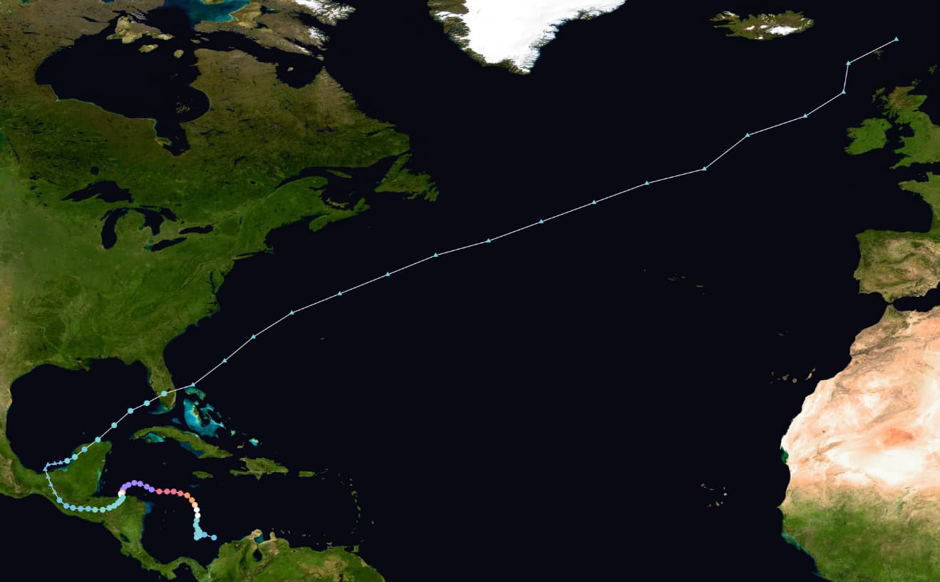 Also I think hurricanes get worse with climate change because they form in really warm oceans. There was Hurricane Mitch that entirely devastated alot of the central american countries. What I thought was weird is that specific hurricane was so resistant that from the Gulf of Mexico it travelled to MidWest until it passed New York to then bring strong waves in Dublin. Thatâs a horrifying distance.
