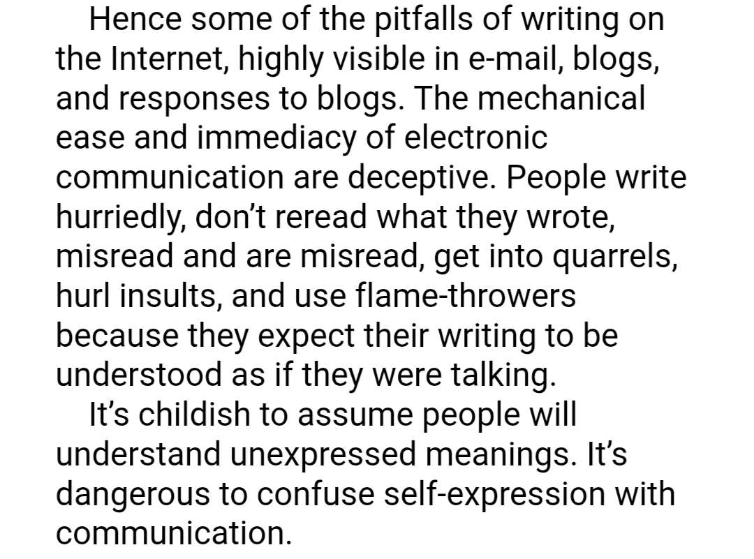I think… the quote is kind of weird, because it sort of applies a standard of “pieces of writing” to internet flamewars, sort of saying people are essentially trying to do writing but expect to be understood as if they are talking, and that they should instead be writing better.