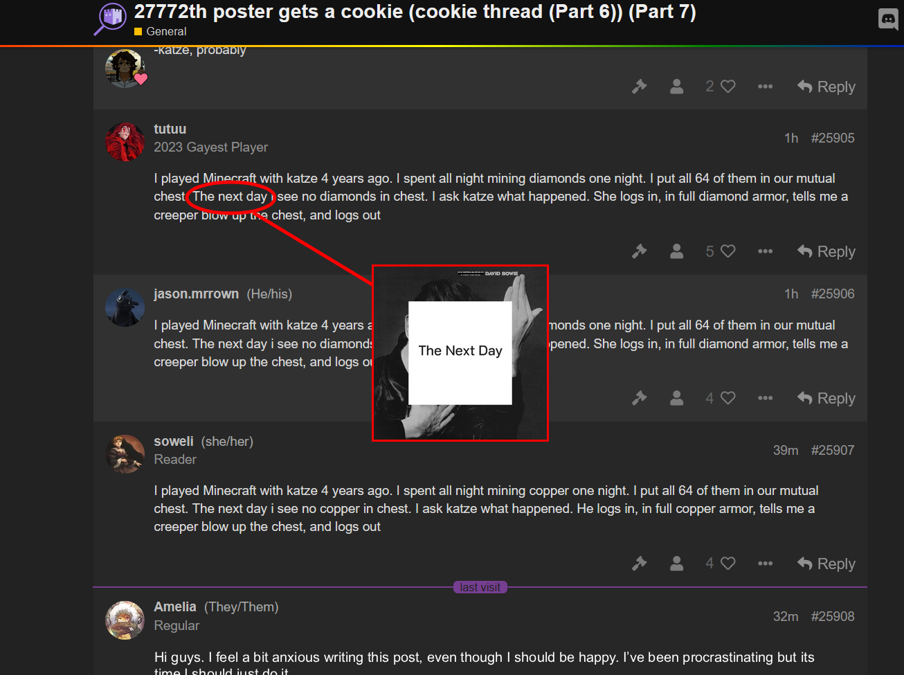 I played Minecraft with katze 4 years ago. I spent all night mining diamonds one night. I put all 64 of them in our mutual chest. The next day i see no diamonds in chest. I ask katze what happened. She logs in, in full diamond armor, tells me a creeper blow up the chest, and logs out