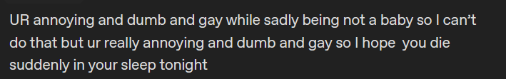Once my girlfriend googled âhow to explode my dumb gay babyâ, because she wanted to explode me, and got a response from Gemini explaining how thatâs actually an extremely offensive thing to say, and that you should not be considering violence against your infant child, who is not âdumbâ or âgayâ