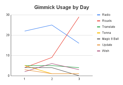 Anyways, I got bored, so I graphed the amount of posts made for each of the gimmicks within the account I used for the recent MU mash thing.