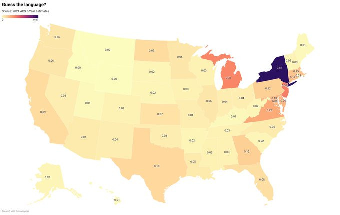 this guy on twitter posts maps of the US states by native speakers of a language and you have to get the language. I’m usually okay but i am really proud i got this one