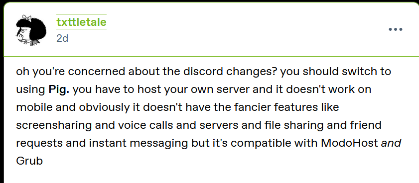 we’re all switching to discourse messaging now that discord requires identification for mass surveillance.