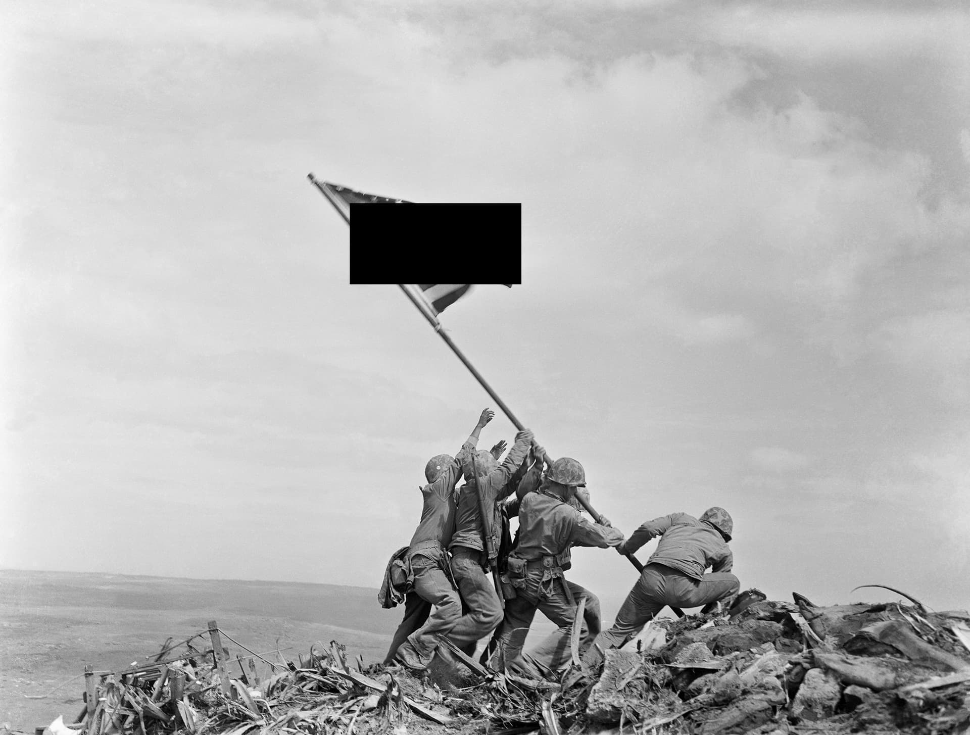 raising the flag iwo jima but instead of the us flag its a banner with a slur on it