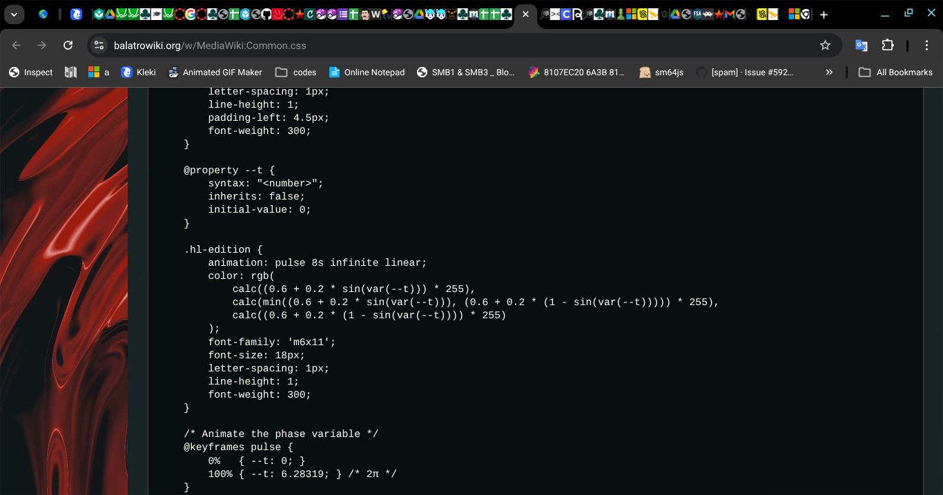 The gradient details aren’t in the page for Negatives themselves, they aren’t in the template for Editions, they’re in the template labelled “Hl” which then links to three things: Hl/styles.css, Highlight.css, and MediaWiki:Common.css. It’s in the last of those three, not in the form of like 2 hex codes for a start and end point, but in the form of a sin equation that I then have to plot into desmos, tweak it to actually fit desmos’ syntax, and then get the r, g, and b values for 8 points over the period of 2π, put those into Kleki as rgb values, and then finally copy the hex values for each one and paste them into the word Negative.