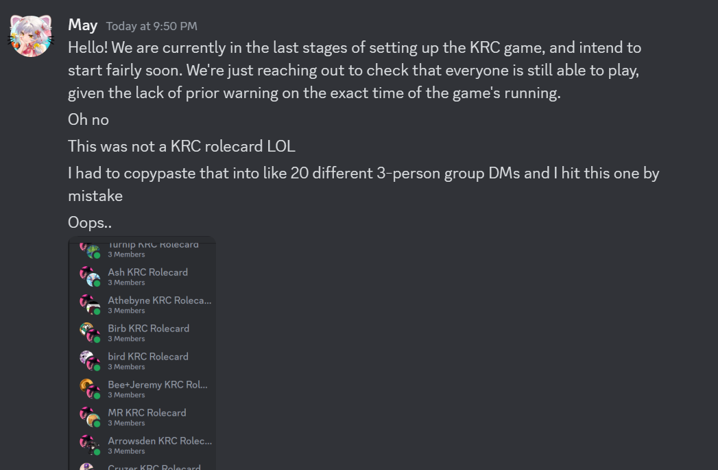 Accidentally sent a copypasta message to the group chat with my ex and our friend where we’d organise Civ games because I was mass-messaging mafia rolecard chats
