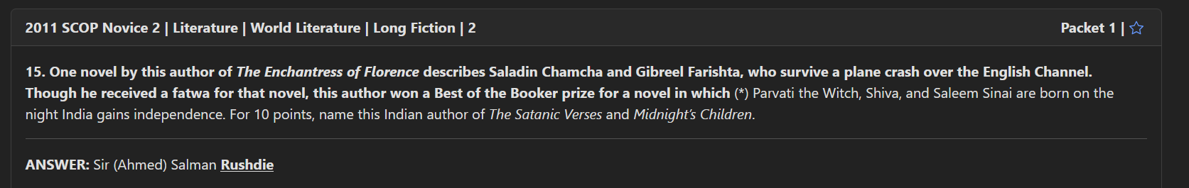 Didn’t get teh tossup. Got Arabic, didn’t get plural, my eyes jumped ahead on standard before I could assess