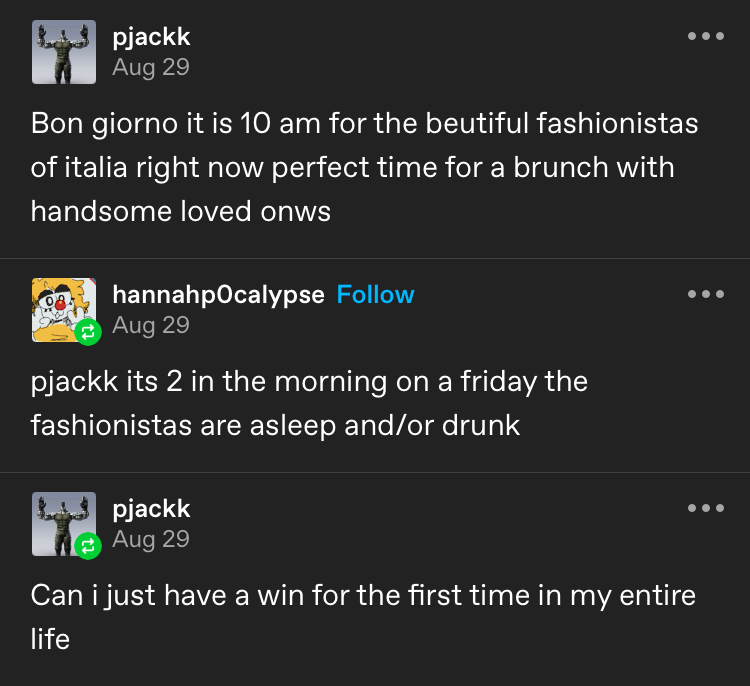 Pjackk is roleplaying as Tekken character Prototype Jack and posts awful pictures of food and Grindr screenshots and shit and everybody heckles him. Those are the rules. Greatest blog on Tumblr