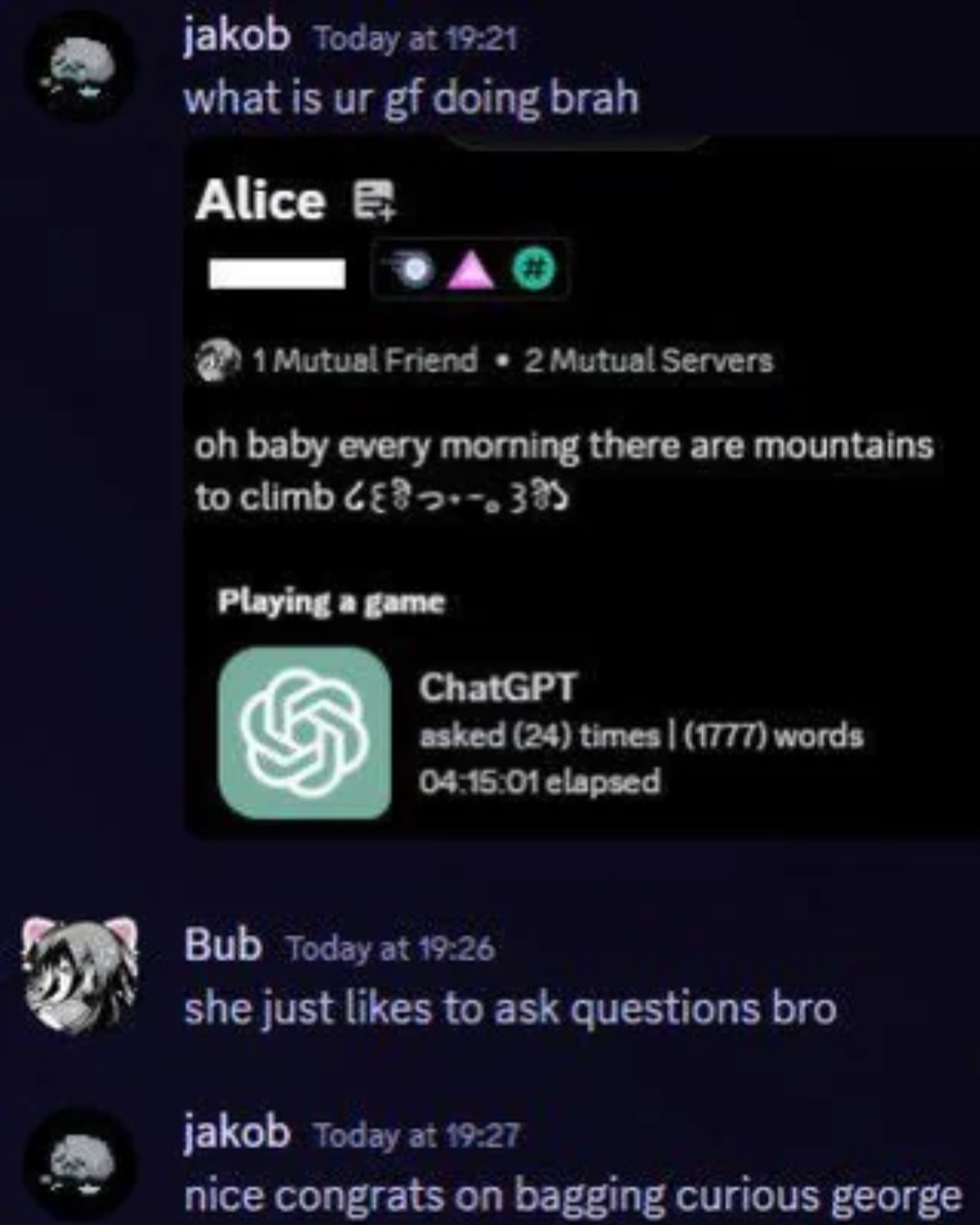 I get “girlfriend is asking Chatgpt a lot of questions” → “person is like haha your girlfriend is curious george for asking chatgpt all those questions”