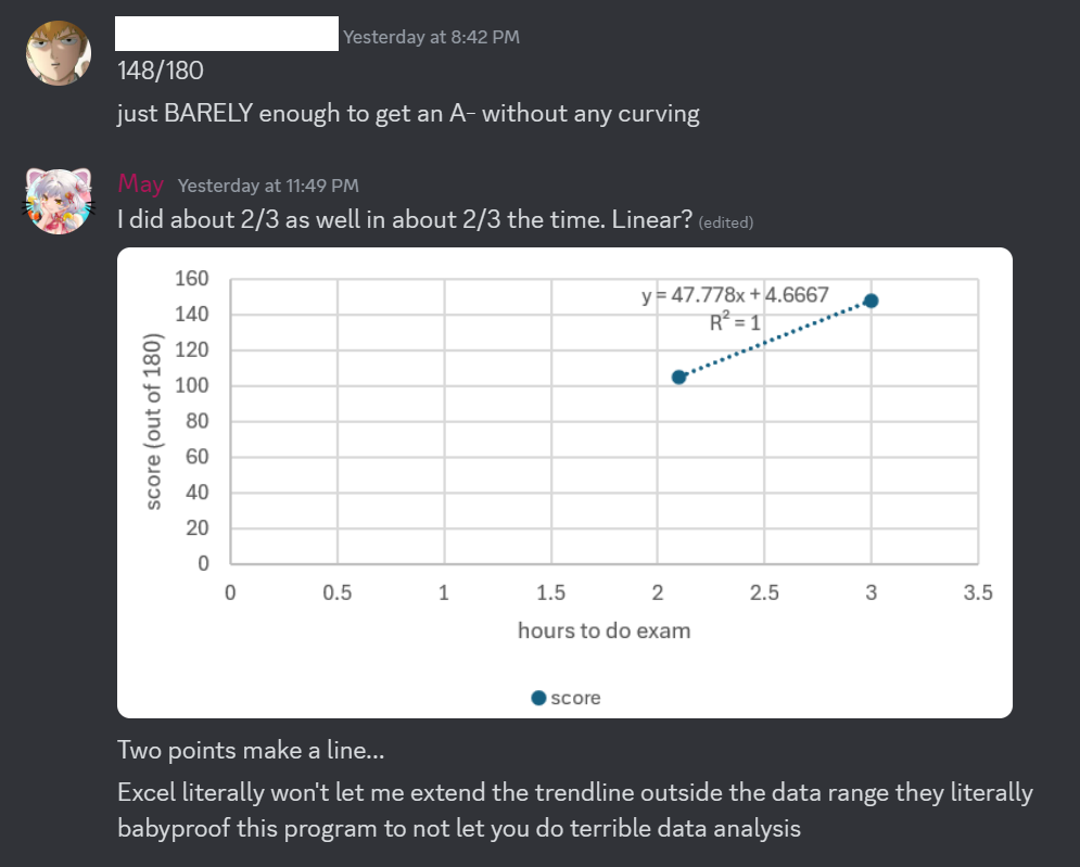 I appear to have gotten a 105/180 on the final which is good for a C+ completely uncurved and a B- curved. I am crying very hard in the professorâs emails and also the dean of studentsâ emails about it but weâll see what happens