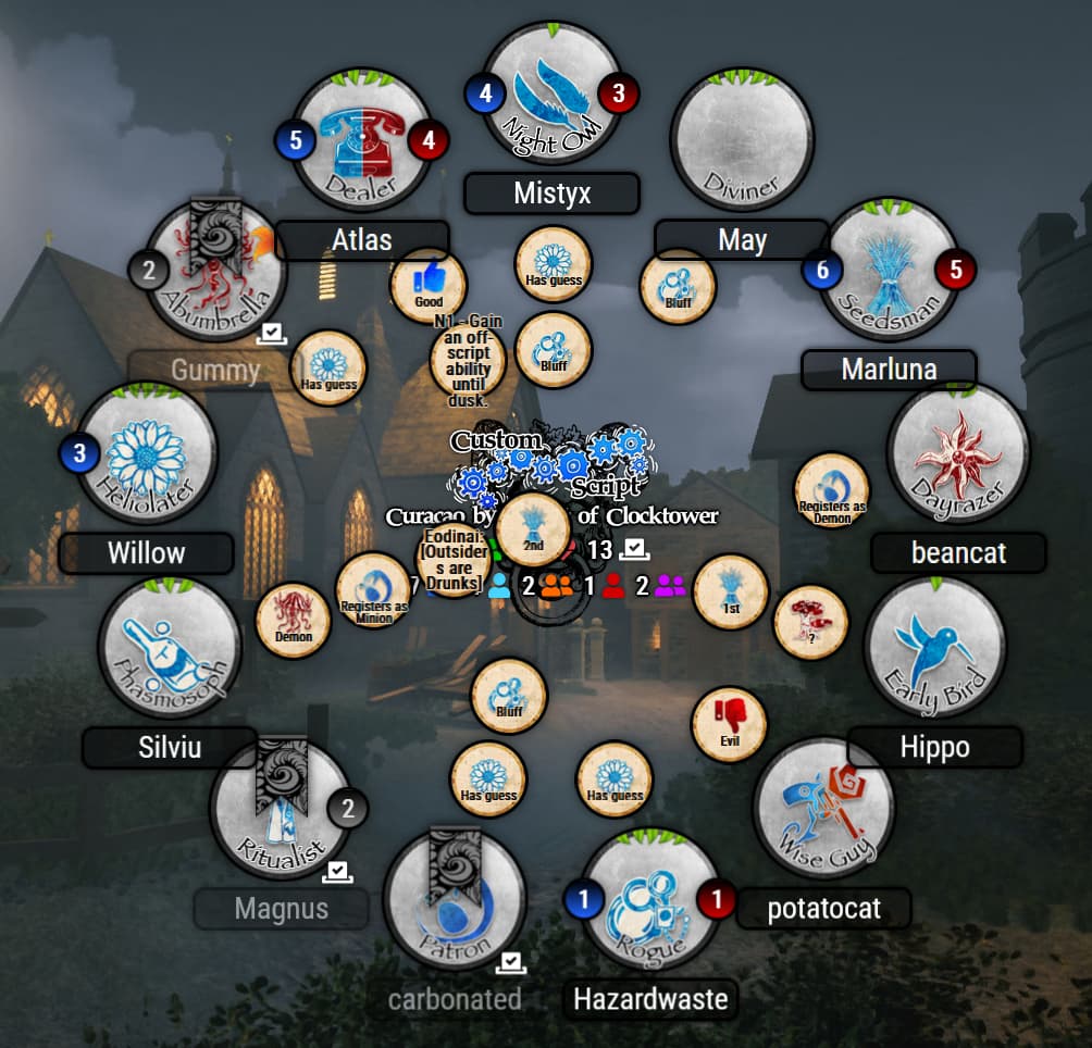 Sorry hippo, I feel youāre evil here. I do believe Marluna as thereās no other way for her to get incorrect info unless youāre specifically evil and Iām assuming she would not know to bluff Seedman when she outted herself really early with Rogue in play.