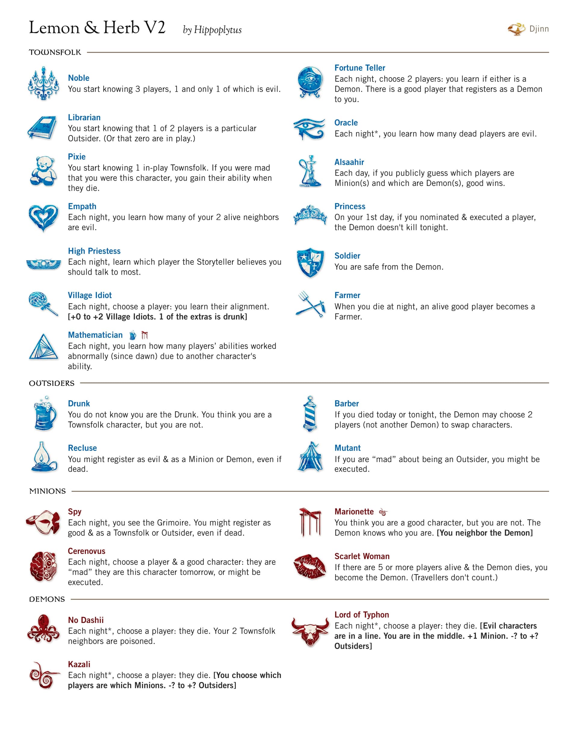 I like scripts that arent too spicy or crazy (hence name) but have some interesting stuff going on. there is some neighour stuff going on, madness package and a few escape routes for demon. Ongoing townfolk are quite strong but recluse/drunk/spy/mario can mess with them and also 2/3 demon have outsider mod so id put more outsiders in bag at start if worried.