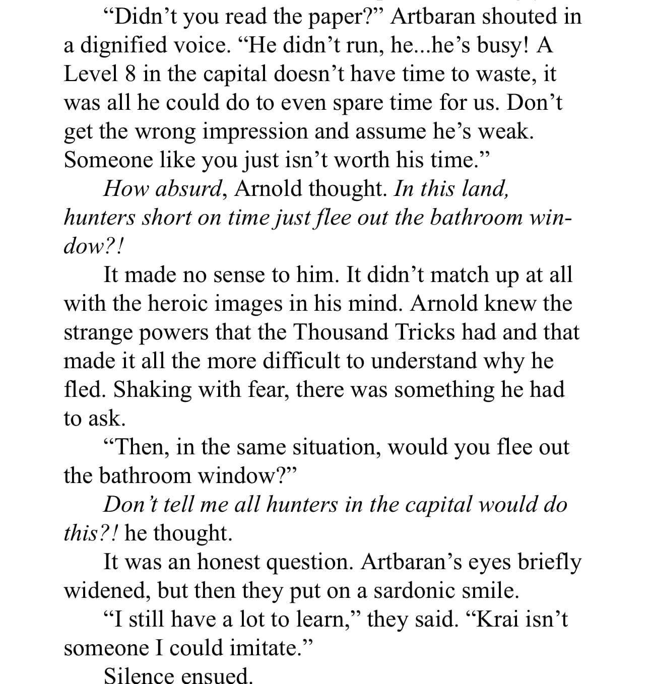 A couple volumes later, after we haven’t seen Arnold in a while, Krai is trying to tame a relic flying carpet who wants to be ridden but is kinda a brat, so she constantly flings him into walls and off her. Anyway he said “damn this carpet has done much damage to me than Arnold” which was really funny