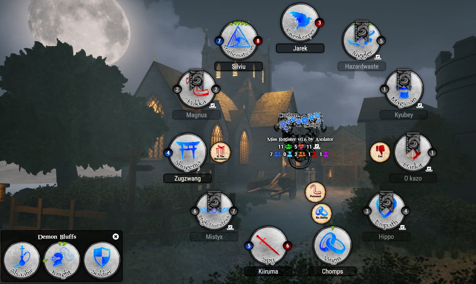 In addition, our Demon, Magnus, expressed that they disliked their bluffs and were considering trying to claim off of it – initially intending to claim to be the Virgin, but changing their course once Chomps instantly claimed that role. Speaking to Magnus and forcing them to claim early on would prevent them from having the flexibility to back into a role off of the bluffs (Soldier, Knight, and Alsaahir), such as the Undertaker claim they moved back and forth between.