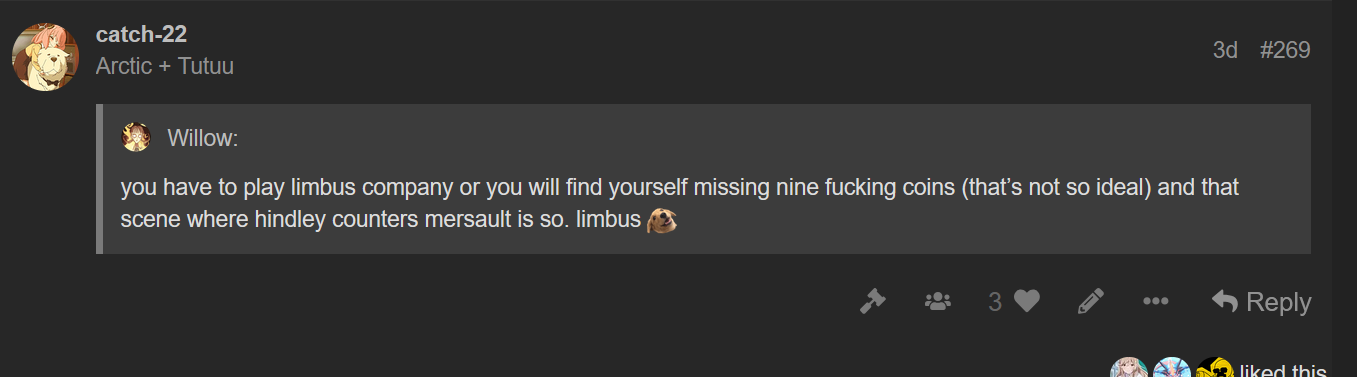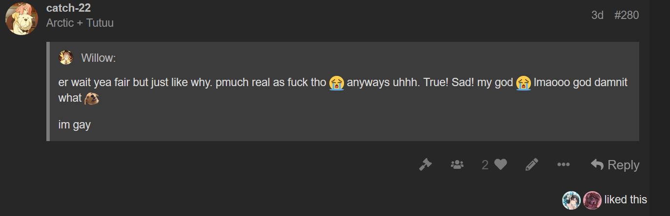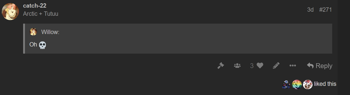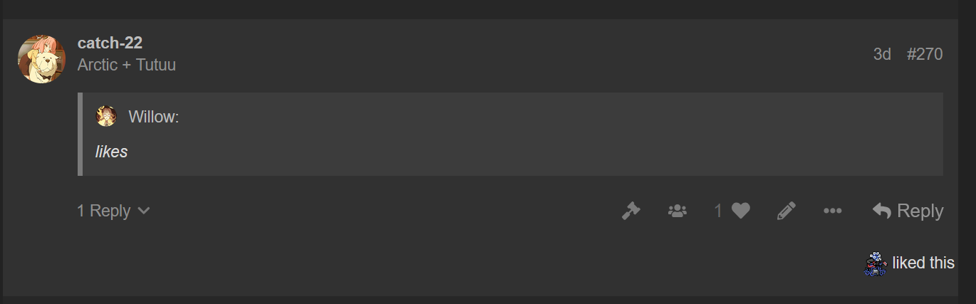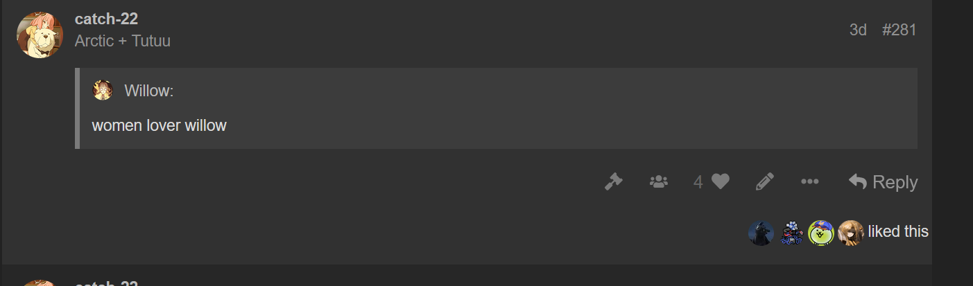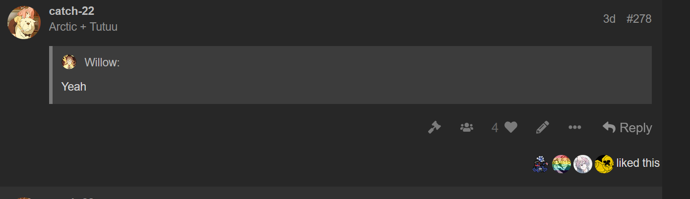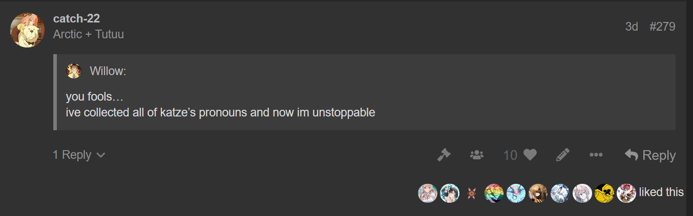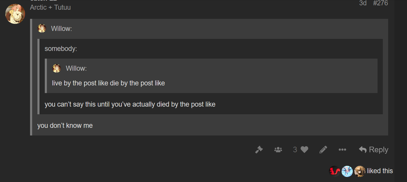 FOR THE RECORD the joke with my Willow one was that everybody was gonna do like 1 or 2 word posts. So I did like ten 1 or 2 word posts at once. Nobody got it