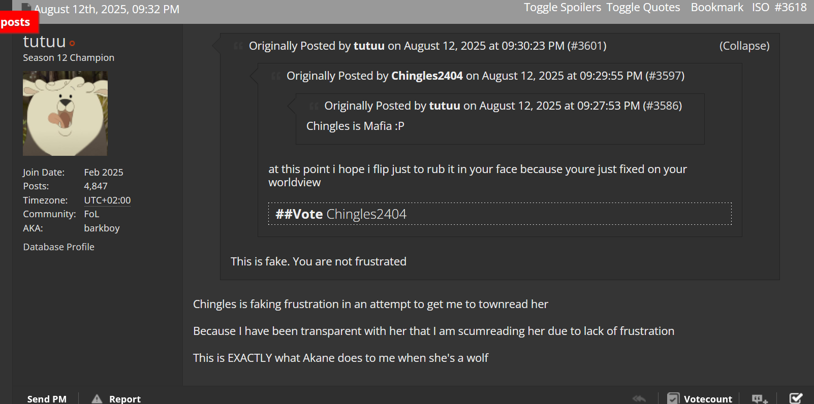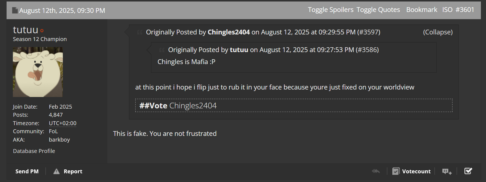 to be clear i’m not like 100% on this, not even 90%, but usually when i am playing a long form game with brad, everyone who is familiar with him from MU realizes he is mafia at the exact same time when he makes some outting posts or doesn’t respond to someone who knows him well, and when he made the post to you voting me and trying to “convince” tutuu it kinda felt like that just because i have no idea where it came from and he made no effort to convince anyone himself