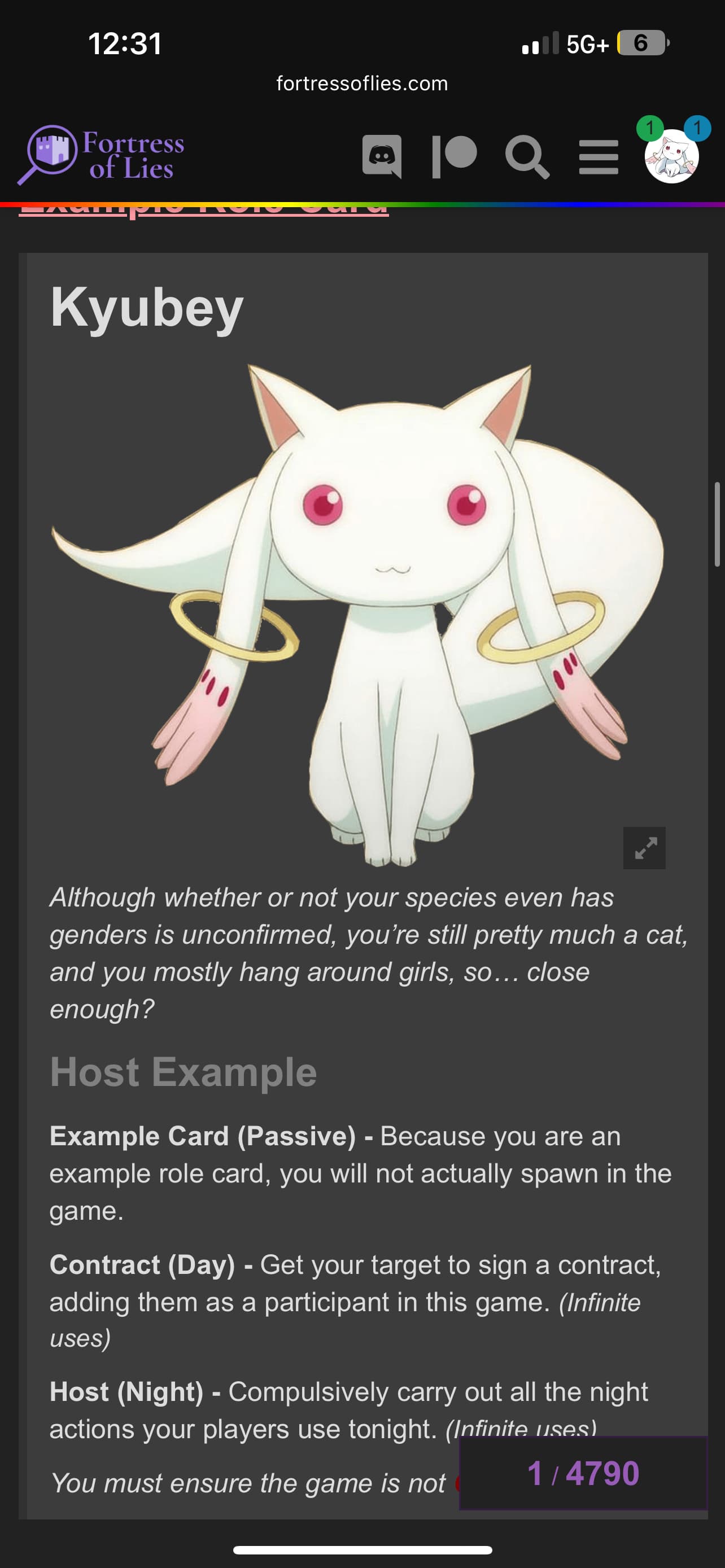 A. My first ever game - it was a magical girl game hosted by Orange? I think? Kyubey was an example role card in the OP. I did not know it was an example role card and I joined the game. People spent half the game thinking I was a neutral or an alt controlled by someone.