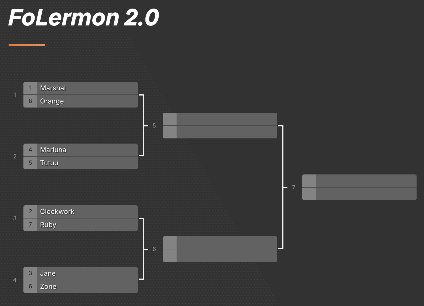 As a reminder, this is a Double Battle: you will be fighting with four FoLermon total, two starting on the field and two remaining in the back. For example, Marluna may lead with May and Hazard, have Kiiruma and Neon in the back, and not bring Jarek and Gummy to the fight.