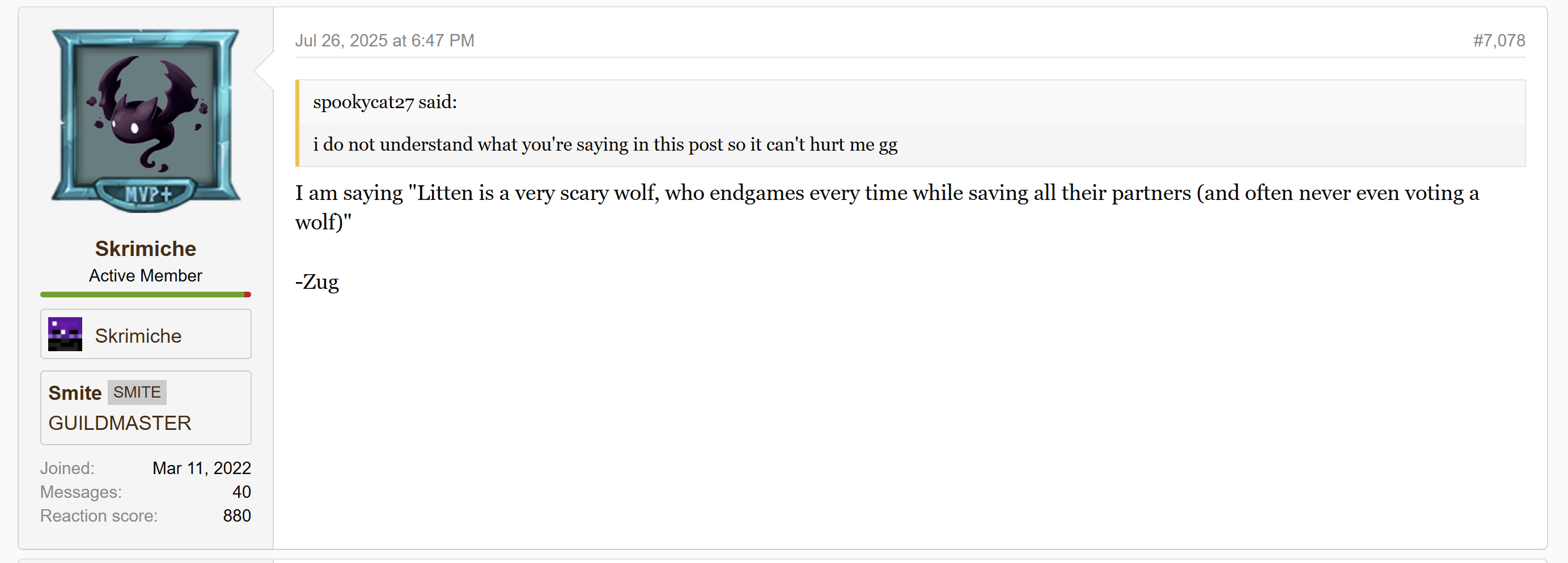 Sorry I went MIA for most of D2. I think this game taught me that non-rolemadness setups with players I’m not familiar with aren’t for me. I got lost with all the meta talk (& I don’t have it in me to go through people’s past games for context). I think that’s the main reason behind my WIM dying