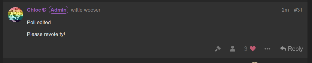 Fwiw if anybody does want their pronouns after their title or under their username or whatever now, i can make it happen individually. Just contact me privately