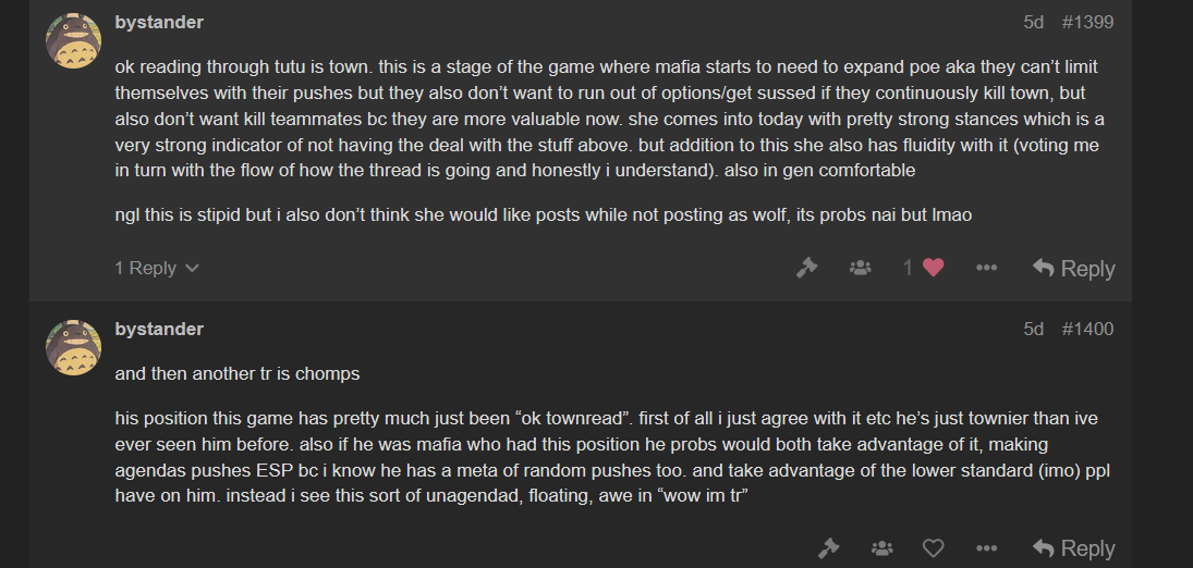 bystander has a ton of interactions with Chomps. He’s one of the person she spoke with the most ITT. I don’t want to list them all. Therefore Chomps is my biggest townread coming into this F4. The interactions don’t seem alien or anxious. They seem normal to me.