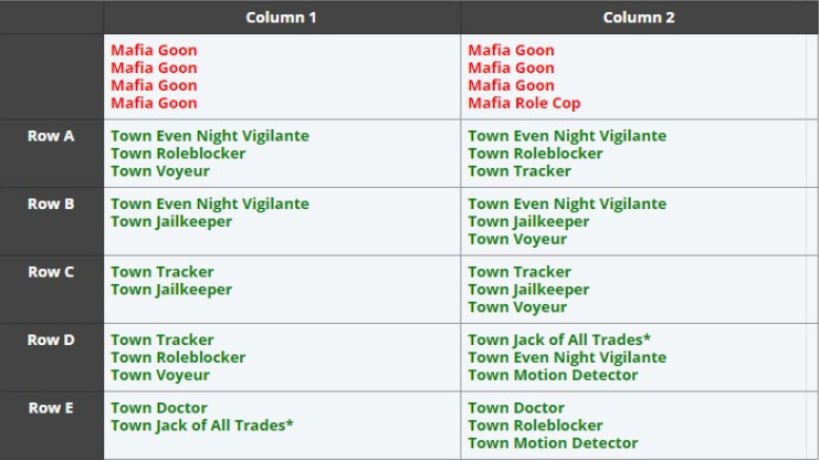 First you randomly select a number to decide the Mafia team’s composition of Power Roles (1-2), then you randomly select a letter to decide the Town’s composition of Power Roles (A-E). Fill in the number of Vanilla Townies needed to make the Town team have 13 members total, and you have your setup.