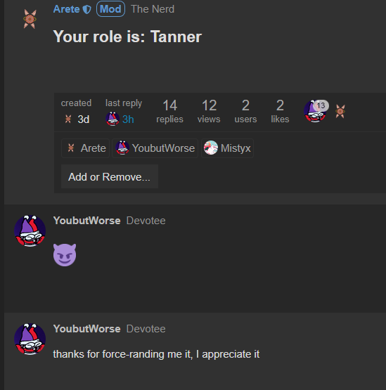 Kiiruma was shielding you so much I just assumed you both were wolves and by that logic you would be the WW and he would be the Minion.
