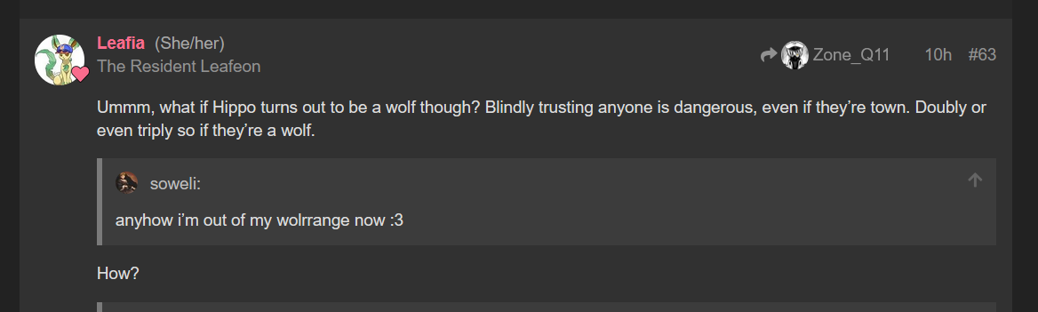 The main thing that bothers me about Tutuu is how trusting heās being. Zone isnāt being the least bit villagery and Tutuu somehow has him as locktown? It feels lowkey partnery to me, especially with hhow Zoneās trust of Hippo seems like TMI on Hippo. Hippo hasnāt even posted yet after all. In fact, I think Hippo might be the only one that hasnāt posted yet.
