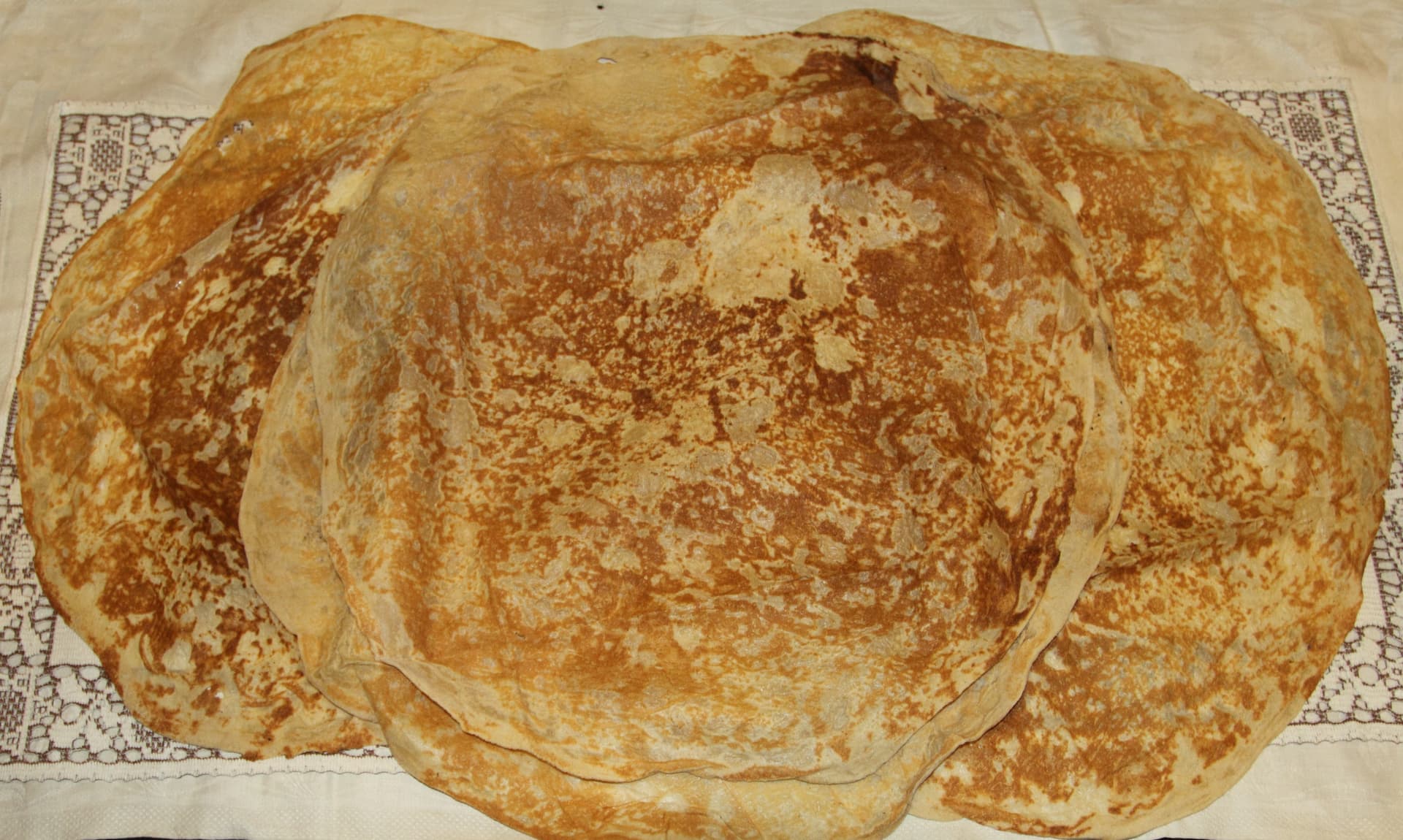 Usually large, round dough, about 2 feet in diameter, kept thin before baking; can be baked either in a clay oven or on a saj, a domed-convex metal griddle.