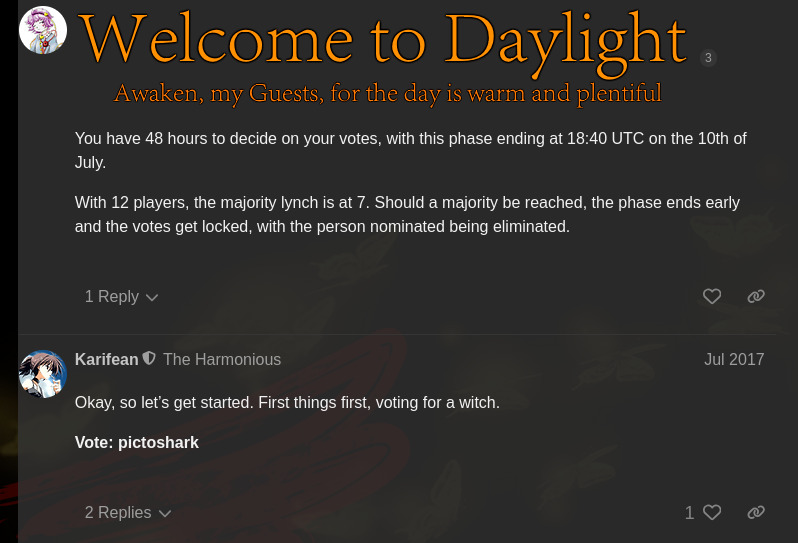 Also these games have some level of that silly forum mafia thing some people do where you can interpret a piece of narration each night phase to try to figure out info. Y’know. That.